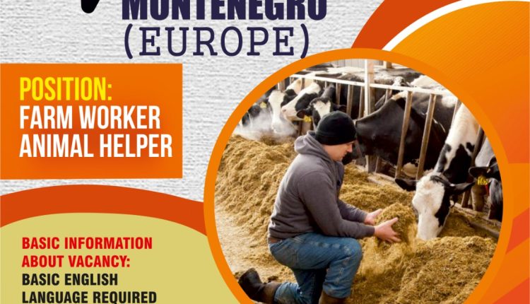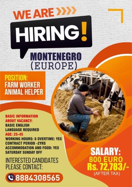 യൂറോപ്പിലെ മോണ്ടിനെഗ്രോയിലേക്ക് ഫാം വർക്കറെയും ആനിമൽ ഹെൽപ്പറെയും ആവശ്യമുണ്ട്. സാലറി 72,783 (800 യൂറോ), യോഗ്യത: ബേസിക് ഇംഗ്ലീഷ്. പ്രായ പരിധി (25 – 45), ജോലി സമയം 8 മണിക്കൂർ ഓവർ ടൈം ലഭ്യമാണ്. ഫുഡ് ആൻഡ് അക്കോമഡേഷൻ. 2 വർഷത്തെ കോൺട്രാക്ടിങ് പീരീഡ്. ശനിയും ഞായറും അവധി.