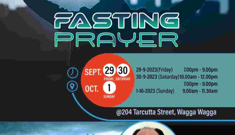 ന്യൂ സൗത്ത് വെയ്ൽസ്: വാഗാ വാഗ ഇമ്മാനുവേൽ ക്രിസ്ത്യൻ ചർച്ചിന്റെ ആഭിമുഖ്യത്തിൽ സെപ്തം 29 – ഒക്ടോ. 1 വരെ ടാർക്കട്ട സ്ട്രീറ്റ് 204 നമ്പർ ഹാളിൽ ഉപവാസ പ്രാർത്ഥന നടക്കും. പാ. ജെയിംസ് വർഗീസ് മുഖ്യപ്രഭാഷണം നടത്തും. പാസ്റ്റർ ഏലിയാസ് ജോൺ , ബ്ര. ലിബു വർഗീസ് എന്നിവർ നേതൃത്വം കൊടുക്കും.