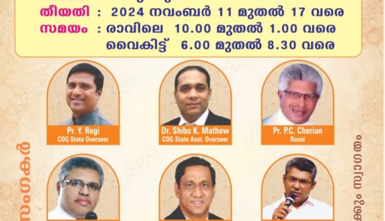 ദിവസവും രാവിലെ പത്തു മുതലും വൈകിട്ട് ആറു മുതലും സഭാഹോളിൽ ക്രമീകരിച്ചിരിക്കുന്ന യോഗങ്ങൾ 17ന് സമാപിക്കും. സഭാശുശ്രൂഷകനും ദൈവസഭ പത്തനംതിട്ട സെന്റർ മിനിസ്റ്ററുമായ പാസ്റ്റർ അനിയൻകുഞ്ഞ് സാമുവേൽ യോഗങ്ങൾക്ക് നേതൃത്വം നൽകും.