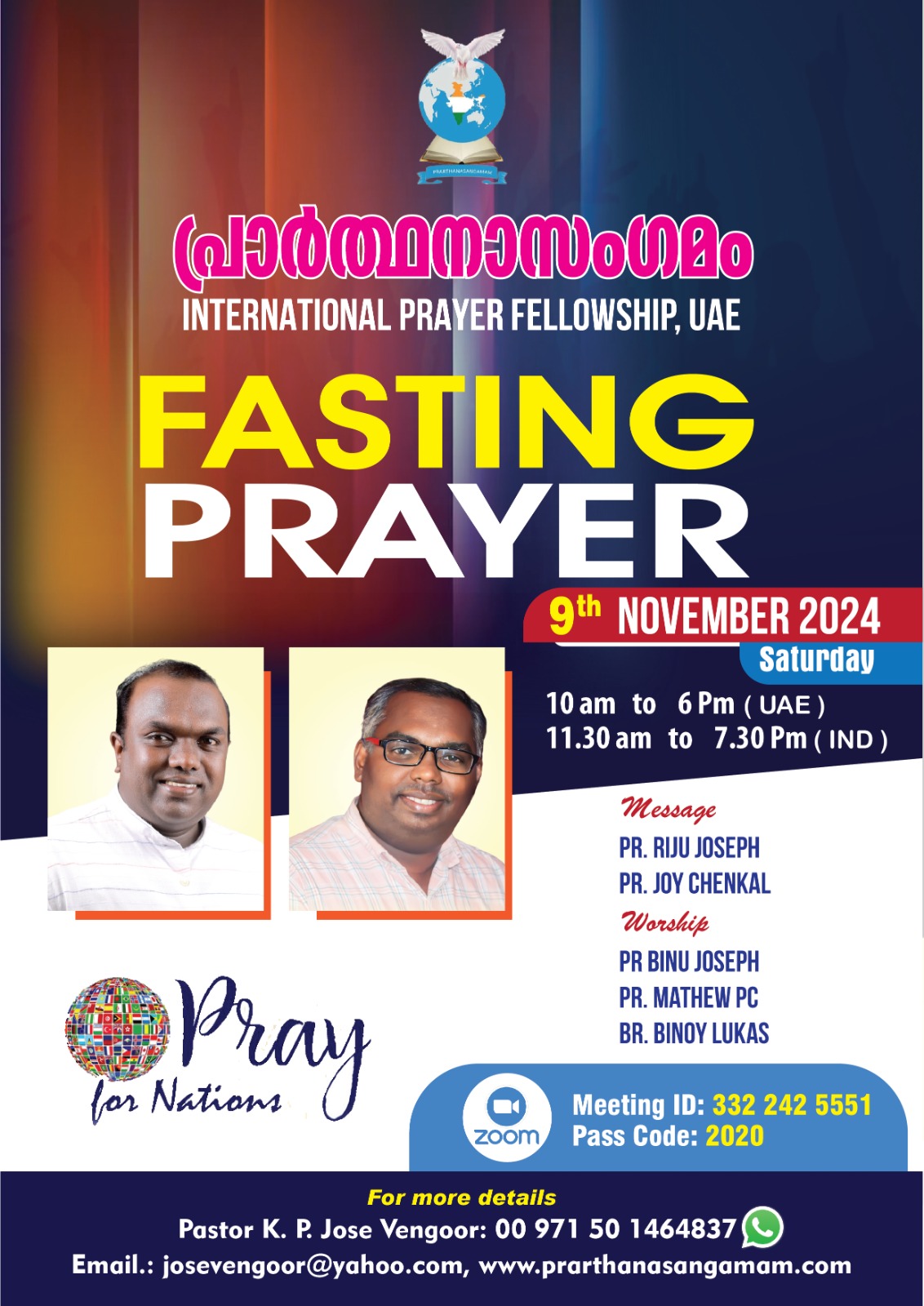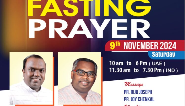 ഷാർജ : ഇന്റർനാഷണൽ പ്രയർ ഫെലോഷിപ്പ് പ്രാർത്ഥനാസംഗമം ഒരുക്കുന്ന ഉപവാസ പ്രാർത്ഥന നവംബർ 9 ശനിയാഴ്ച രാവിലെ പത്തു മുതൽ രാത്രി ആറു വരെ (യു. എ. ഇ സമയം ) നടക്കും. പാസ്റ്റർ റിജു ജോസഫ് , പാസ്റ്റർ ജോയ് ചീനക്കൽ എന്നിവർ പ്രസംഗിക്കും. പാസ്റ്റർ ബിനു ജോസഫ് ,പാസ്റ്റർ മാത്യു പി. സി, ബ്രദർ ബിനോയ് ലൂക്കാസ് എന്നിവർ ആരാധനക്ക് നേതൃത്വം നൽകും. രാജ്യങ്ങൾക്കായും ( Pray for Nations ) മറ്റു വിഷയങ്ങൾക്കായും പ്രാർത്ഥിക്കും. പാസ്റ്റർ കെ. പി. ജോസ് വേങ്ങൂർ നേതൃത്വം നൽകും. Zoom മീറ്റിംഗ് ID 332 242 5551 Paascode: 2020