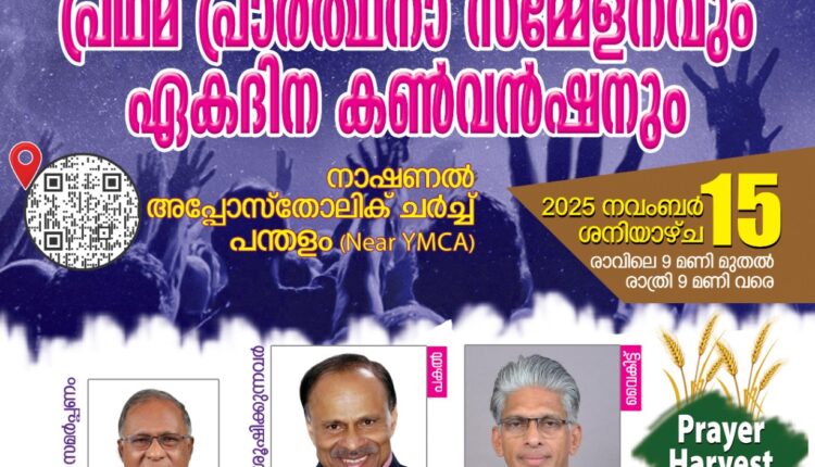 പന്തളം: നാഷണല്‍ പ്രെയര്‍ മൂവ്മെന്‍റിന്‍റെ അമ്പത് ദിനപ്രാര്‍ത്ഥന പന്തളം നാഷണല്‍ അപ്പോസ്തോലിക് ചര്‍ച്ചില്‍ ശനിയാഴ്ച രാവിലെ ഒമ്പതിന് തുടക്കം കുറിക്കും. രാത്രി ഒമ്പത് വരെ തുടരുന്ന പന്ത്രണ്ട് മണിക്കൂര്‍ പ്രാര്‍ത്ഥനയുടെ സമര്‍പ്പണ ശുശ്രൂഷ ചര്‍ച്ച് ഓഫ് ഗോഡ് മുന്‍ അസിസ്ന്‍റന്‍റ് ഓവര്‍സീയര്‍ പാസ്റ്റര്‍ പി.ജി. മാത്യൂസ് നിര്‍വ്വഹിക്കും. പ്രയർ മൂവ്മെന്റ് നാഷണല്‍ ചെയര്‍മാന്‍ ഡോ. കെ.വി. പോള്‍ പകല്‍ യോഗത്തില്‍ ശുശ്രൂഷിക്കും. വൈകിട്ട് ആറിന് ആരംഭിക്കുന്ന കണ്‍വന്‍ഷനില്‍ പാസ്റ്റര്‍ മാത്യു കെ. വര്‍ഗീസ് (Police Mathai)) പ്രസംഗിക്കും.
