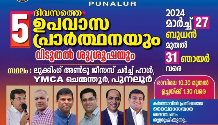 പുനലൂർ : ലുക്കിങ് അൺടു ജീസസ് വർഷിപ്പ് സെന്റർ ഒരുക്കുന്ന വാർഷിക ഉപവാസ പ്രാർത്ഥനയും , വിടുതൽ ശുശ്രുഷയും മാർച്ച് 27 മുതൽ 31 വരെ രാവിലെ 10 : 30 മുതൽ ഉച്ചയ്ക്ക് 1 : 30 വരെ പുനലൂർ ചെമ്മന്തൂർ വൈ എം സി എ ഹാളിൽ നടത്തപ്പെടും. പാ. ഷാജി വർഗീസ് , പാ. ബിജു സി എസ് ഫോർട്ട് കൊച്ചി , പാ. സാമുവേൽ വിത്സൺ , പാ. സാം മണ്ണിൽ , പാ. മോനി ജോസഫ് ഷാർജ എന്നിവർ ശുശ്രുഷിയ്ക്കും. പാ . ജോഷി ഗീവർഗീസ് ശുശ്രുഷകൾക്കു നേതൃത്വം നൽകും . എൽ ജെ എം വോയിസ് ഗാനശുശ്രുഷയ്ക്കു നേതൃത്വം നൽകും.