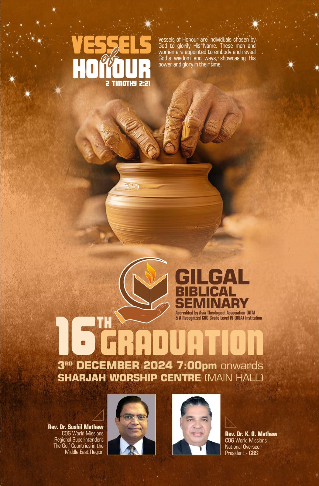 ഷാർജ : ഗിൽഗാൽ ബിബ്ലിക്കൽ സെമിനാരി പതിനാറാമത് ഗ്രാജുവേഷൻ ഷാർജ വർഷിപ്‌ സെന്ററിൽ നടക്കും. ഡിസംബർ 3 ചൊവാഴ്ച വൈകുന്നേരം 7:00 നു മെയിൻ ഹാളിലേക്കുള്ള നയനാന്ദകരമായ മാർച്ച് പാസ്റ്റോടെ ആണ് ഗ്രാജുവേഷൻ സെറിമണി ആരംഭിക്കുന്നത്. 2 തിമോത്തി 2:21 “..ഇവയെ വിട്ടകന്നു തന്നെത്താൻ വെടിപ്പാക്കുന്നവൻ വിശുദ്ധവും ഉടമസ്ഥന്നു ഉപയോഗവുമായി നല്ലവേലെക്കു ഒക്കെയും ഒരുങ്ങിയിരിക്കുന്ന മാനപാത്രം ആയിരിക്കും..” എന്ന വചനത്തിൽ നിന്ന് “മാന പാത്രം” എന്ന തീം അസ്പദ്ധീകരിച്ചാണ് ഈ തവണ ഇവന്റ് ക്രമീകരിച്ചിരിക്കുന്നത്‌. ഗിൽഗാൽ വൈസ് പ്രസിഡന്റ് റവ. ഷാൻ മാത്യു വിന്റെ അധ്യക്ഷതയിൽ നടക്കുന്ന ഗ്രാജ്വേഷനിൽ