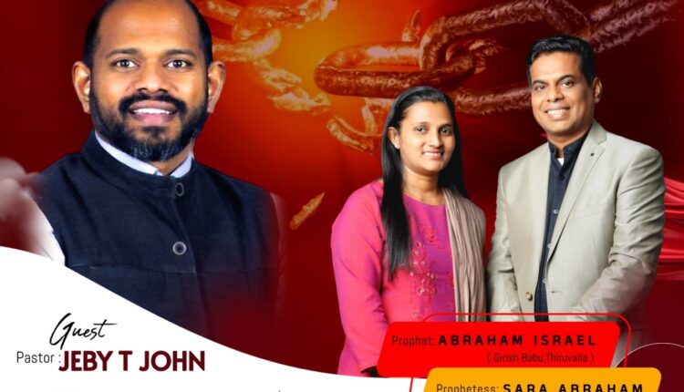 തിരുവല്ല : ഗ്ലോബൽ ഫെയ്ത് ഫാമിലി മിനിസ്ട്രിയുടെ അഭിമുഖ്യത്തിൽ ഫെബ്രുവരി 13 മുതൽ 16 വരെ തിരുവല്ല മനക്കച്ചിറ ജംഗ്ഷൻ സത്യം കൂടാരത്തിന് ഓപ്പോസിറ്റ് നാല് ദിവസ ഉപവാസ പ്രാർത്ഥന നടക്കും. പാ. ജെബി ടി ജോയ് പ്രസംഗിക്കും. പാ. എബ്രഹാം ഇസ്രായേൽ, സിസ്റ്റർ സാറ എബ്രഹാം എന്നിവർ നേതൃത്വം നൽകും.