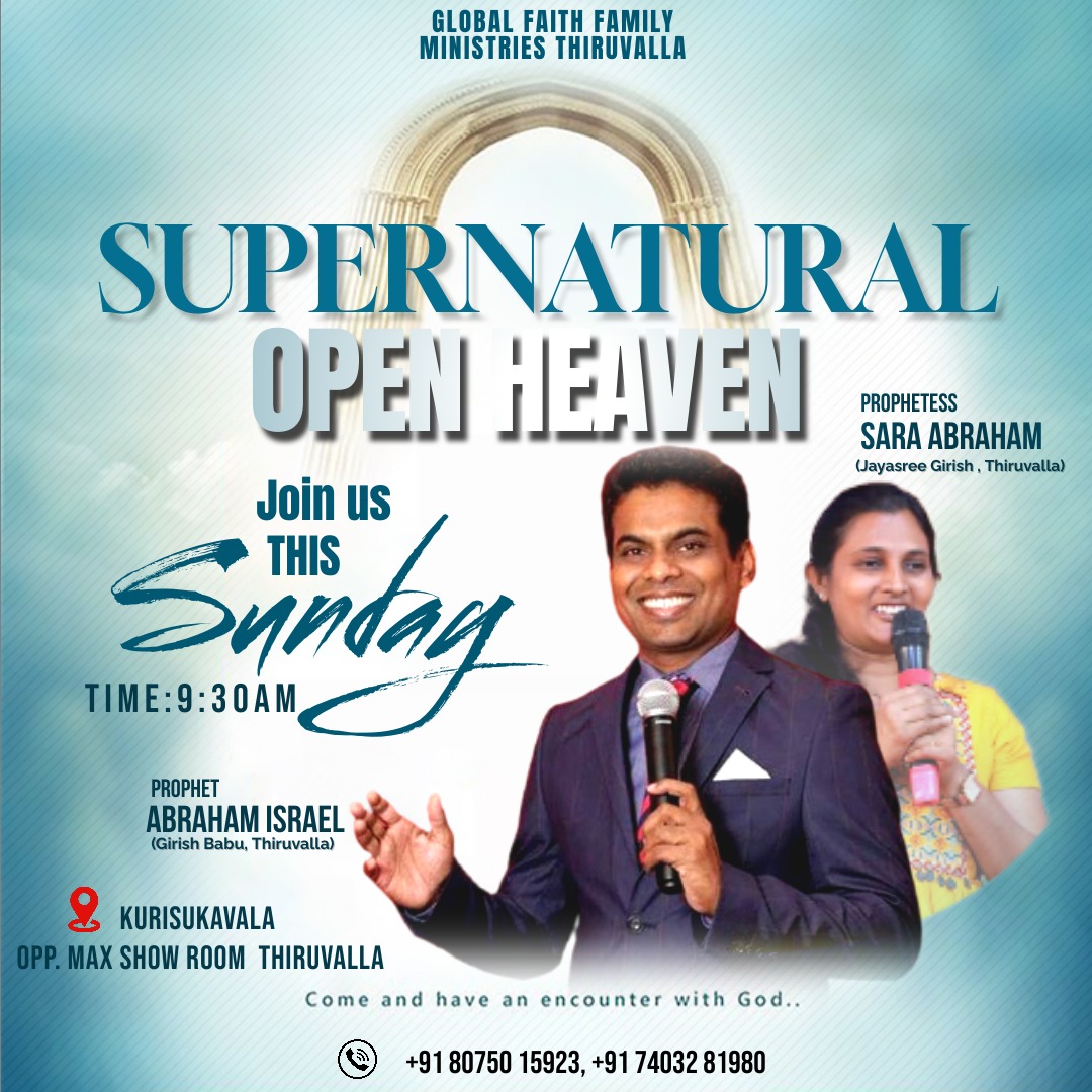 ഗ്ലോബൽ ഫെയ്ത് ഫാമിലി മിനിസ്ട്രി സൺഡേ സർവീസ് ChristianNews On Sep 13, 2024 75 തിരുവല്ല : ഗ്ലോബൽ ഫെയ്ത് ഫാമിലി മിനിസ്ട്രിയുടെ അഭിമുഖ്യത്തിൽ ഞായറാഴ്ച തിരുവല്ല കുരിശുകവലയിൽ സൂപ്പർ നാച്ചുറൽ ഓപ്പൺ ഹെവൻ എന്ന തീമിൽ ആരാധന നടക്കും. പാ. ഗിരീഷ് ബാബു, സിസ്റ്റർ സാറ എബ്രഹാം എന്നിവർ പ്രസംഗിക്കും. 75 Share