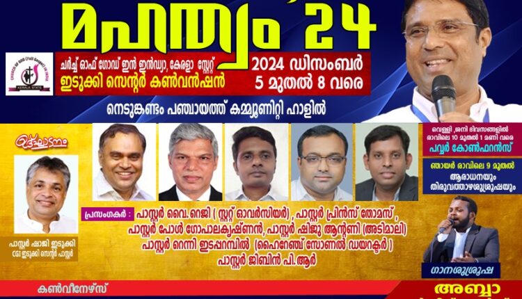 നെടുംങ്കണ്ടം: ചർച്ച് ഓഫ് ഗോഡ് ഇൻ ഇന്ത്യാ കേരളാ സ്റ്റേറ്റ് ഇടുക്കി സെന്റർ കൺവൻഷൻ – മഹത്വം ’24 എന്ന പേരിൽ ഡിസംബർ 5 മുതൽ 8 വരെ നെടുംകണ്ടം പഞ്ചായത്ത് കമ്മ്യൂണിറ്റി ഹാളിൽ നടക്കും. ഇടുക്കി സെന്റർ ശുശ്രൂഷകൻ പാസ്റ്റർ ഷാജി ഇടുക്കി ഉദ്ഘാടനം നിർവഹിക്കും.