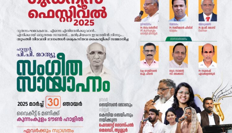 കുന്നംകുളം: ദൂതസംഘമാകവെ എന്നെ എതിരേൽക്കുവാൻ,മാർച്ച് 30 ഞായർ വൈകീട്ട് 6 മണിക്ക് പാസ്റ്റർ: പി.പി. മാത്യു സംഗീത സായാഹ്നം ഗുഡ്ന്യൂസ് ഫെസ്റ്റിവൽ-2025 കുന്നംകുളം ടൗൺ ഹാളിൽ വെച്ച് നടത്തപ്പെടും. ലോകേ ഞാനെൻ ഓട്ടം തികച്ചു, വന്ദനമേ യേശു രക്ഷകനൻ നായകനേ, മൽപ്രിയനെ ഇദ്ധരയിൽ നിന്നു നിൻ,എന്നീ അനശ്വര ഗാനങ്ങളുടെ രചയിതാവായ പാസ്റ്റർ. പി.പി. മാത്യുവിൻ്റെ ഗാനങ്ങളുടെ അവതരണവും ഉണ്ടായിരിക്കും.
