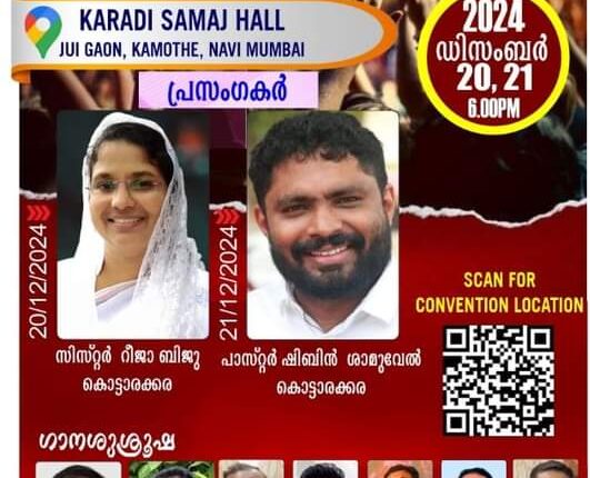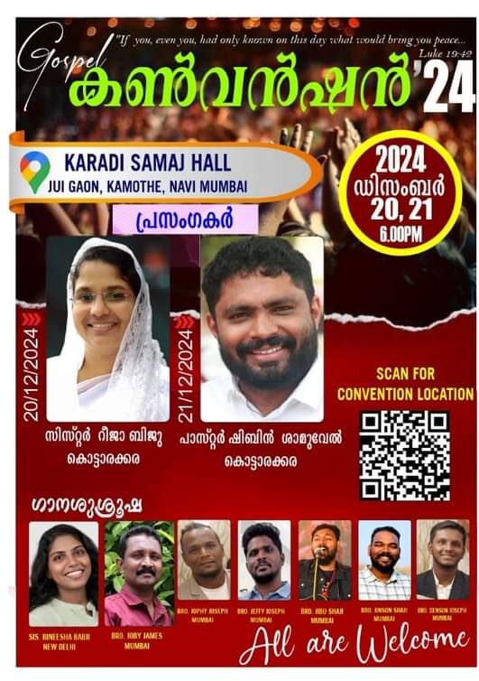 മുംബൈയിൽ ഗോസ്പൽ കൺവൻഷൻ ChristianNews On Sep 24, 2024 70 മുംബൈ : നവി മുംബൈ കാമോത്തേ ജുയി ഗാൺ, കാരാഡി സമാജ് ഹാളിൽ ഡിസംബർ 20 നും 21 നും ഗോസ്പൽ കൺവൻഷൻ നടക്കും. സിസ്റ്റർ റീജാ ബിജു കൊട്ടാരക്കര, പാ. ഷിബിൻ ശാമുവേൽ എന്നിവർ പ്രസംഗിക്കും. സിസ്റ്റർ ബിനീഷ കർ, വൈ. ജെയിംസ് തുടങ്ങിയവർ ഗാന ശുശ്രുഷ നയിക്കും. 70 Share