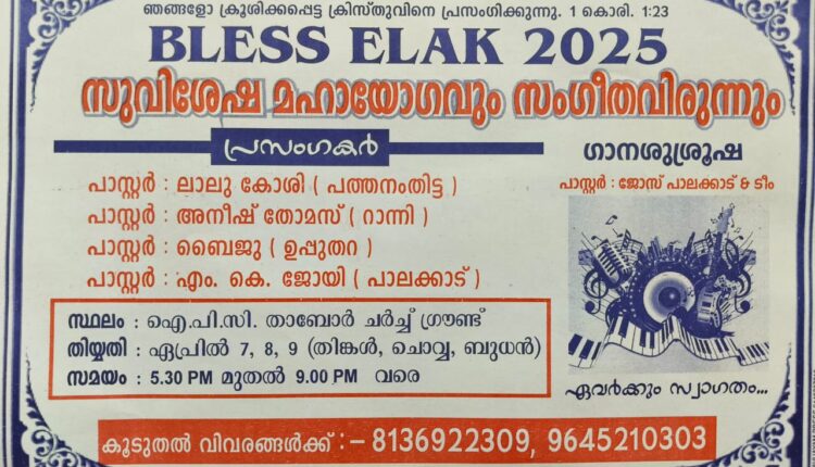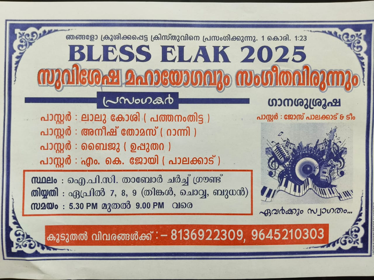 ഐപിസി താബോർ ചർച്ച് ഗ്രൗണ്ടിൽ സുവിശേഷ മഹായോഗവും സംഗീതവിരുന്നും ChristianNews On Mar 10, 2025 150 പത്തനംതിട്ട : ഏപ്രിൽ 7 മുതൽ 9 വരെ ഐപിസി താബോർ ചർച്ച് ഗ്രൗണ്ടിൽ സുവിശേഷ മഹായോഗവും സംഗീതവിരുന്നും നടക്കും. പാസ്റ്റർമാരായ ലാലു കോശി, അനീഷ് തോമസ്, ബൈജു, എം കെ ജോയി എന്നിവർ പ്രസംഗിക്കും. ജോസ് പാലക്കാട് & ടീം ഗാന ശുശ്രൂഷ നയിക്കും. 150 Share