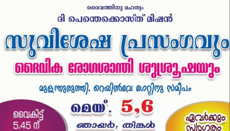 മുളന്തുരുത്തി: ദി പെന്തെക്കൊസ്ത് മിഷൻ മുളന്തുരുത്തി സഭയുടെ ആഭിമുഖ്യത്തിൽ സുവിശേഷ പ്രസംഗം മെയ് 5, 6 തീയതികളിൽ നടക്കും. നാളെയും മറ്റെന്നാളും വൈകിട്ട് 5.45 ന് സുവിശേഷ പ്രസംഗം മുളന്തുരുത്തി റെയിൽവേ ഗേറ്റിന് സമീപം നടക്കും.