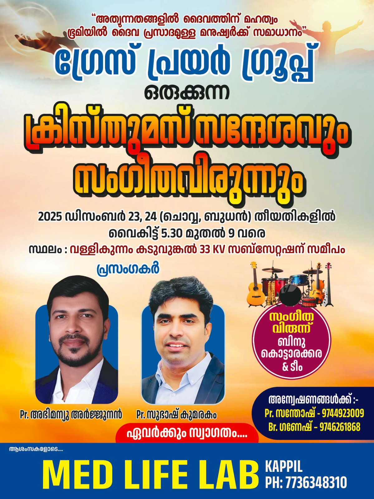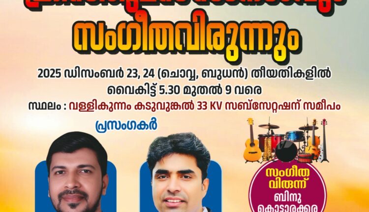 വള്ളിക്കുന്നം : ഗ്രെയ്സ് പ്രയർ ഗ്രൂപ്പിന്റെ ആഭിമുഖ്യത്തിൽ വള്ളിക്കുന്നം കടുവുങ്കൽ 33 കെവി സബ് സ്റ്റേഷന് സമീപം ഇന്നലെ വൈകുനേരം ആരംഭിച്ച ക്രിസ്തുമസ് സന്ദേശവും സംഗീത വിരുന്നും ഇന്ന് വൈകിട്ട് സമാപിക്കും. പാ. അഭിമന്യു അർജുനൻ, പാ. സുഭാഷ് കുമരകം എന്നിവർ പ്രസംഗിക്കുന്നു. ബിനു കൊട്ടാരക്കര & ടീം ഗാന ശുശ്രൂഷയ്ക്ക് നേതൃത്വം നൽകുന്നു.