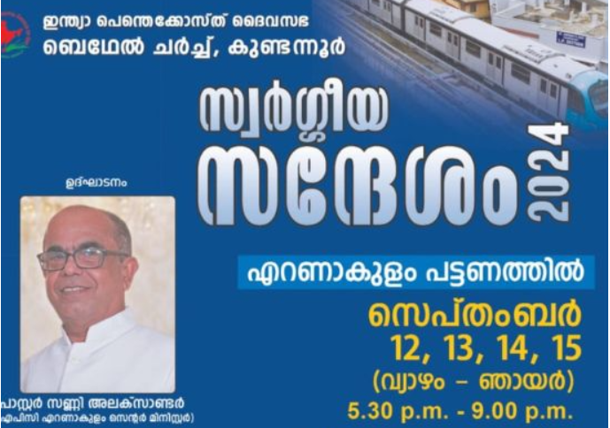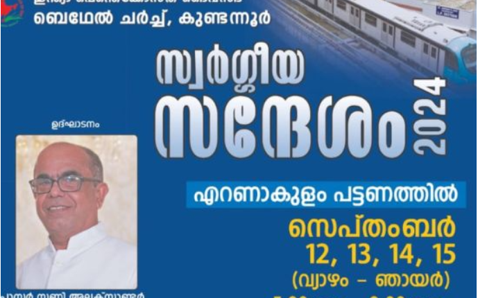 എറണാകുളം : ഐപിസി കുണ്ടന്നൂർ ബഥേൽ ചർച്ചിന്റെ ആഭിമുഖ്യത്തിൽ സെപ്റ്റംബർ 12 മുതൽ 15 വരെ കുണ്ടന്നൂർ ജംഗ്ഷനിൽ സ്വർഗ്ഗീയ സന്ദേശം ബൈബിൾ കൺവെൻഷൻ നടക്കും.