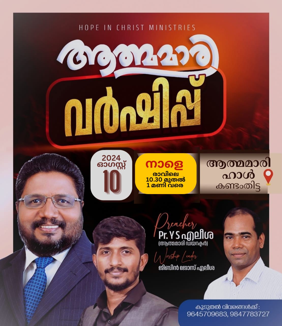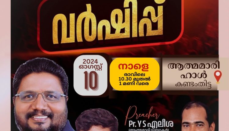 കണ്ടംതിട്ടയിൽ ആത്മമാരി വർഷിപ്പ് ChristianNews On Aug 9, 2024 69 കണ്ടംതിട്ട : ഹോപ്പ് ഇൻ ക്രൈസ്റ്റ് മിനിസ്ട്രിയുടെ ആഭിമുഖ്യത്തിൽ ഇന്ന് രാവിലെ 10:30 മുതൽ 1 മണി വരെ കണ്ടംതിട്ട ആത്മമാരി ഹാളിൽ ആത്മമാരി വർഷിപ്പ് നടക്കും. പാ. വൈ. എസ്. എലീശാ പ്രസംഗിക്കും, ജിബിൻ ജോസ് എലീശാ ഗാന ശുശ്രുഷകൾക്ക് നേതൃത്വം നൽകും. 69 Share