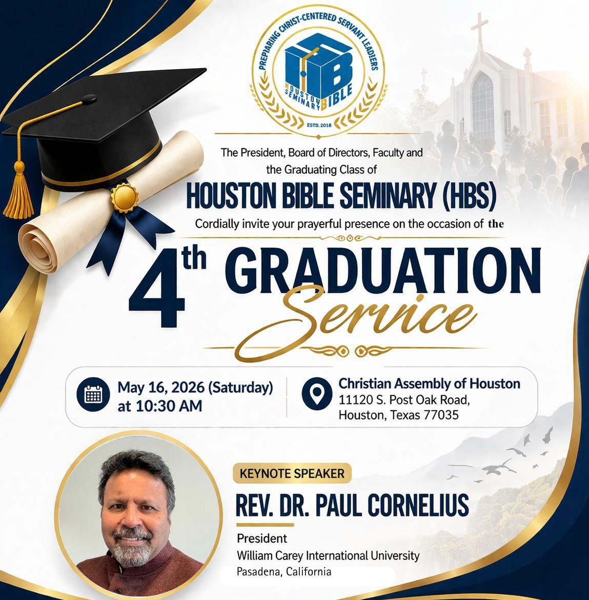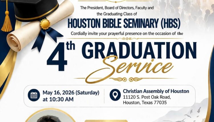 ഹൂസ്റ്റൺ: ഹൂസ്റ്റൺ ബൈബിൾ സെമിനാരി (HBS)യുടെ 4-ാമത് ഗ്രാജുവേഷൻ സർവീസ് മേയ് 16 ശനിയാഴ്ച രാവിലെ 10.30ന് ഹൂസ്റ്റണിലെ ക്രിസ്ത്യൻ അസംബ്ലി ഓഫ് ഹൂസ്റ്റൺ ചർച്ചിൽ (11120 S. Post Oak Road) നടക്കും.