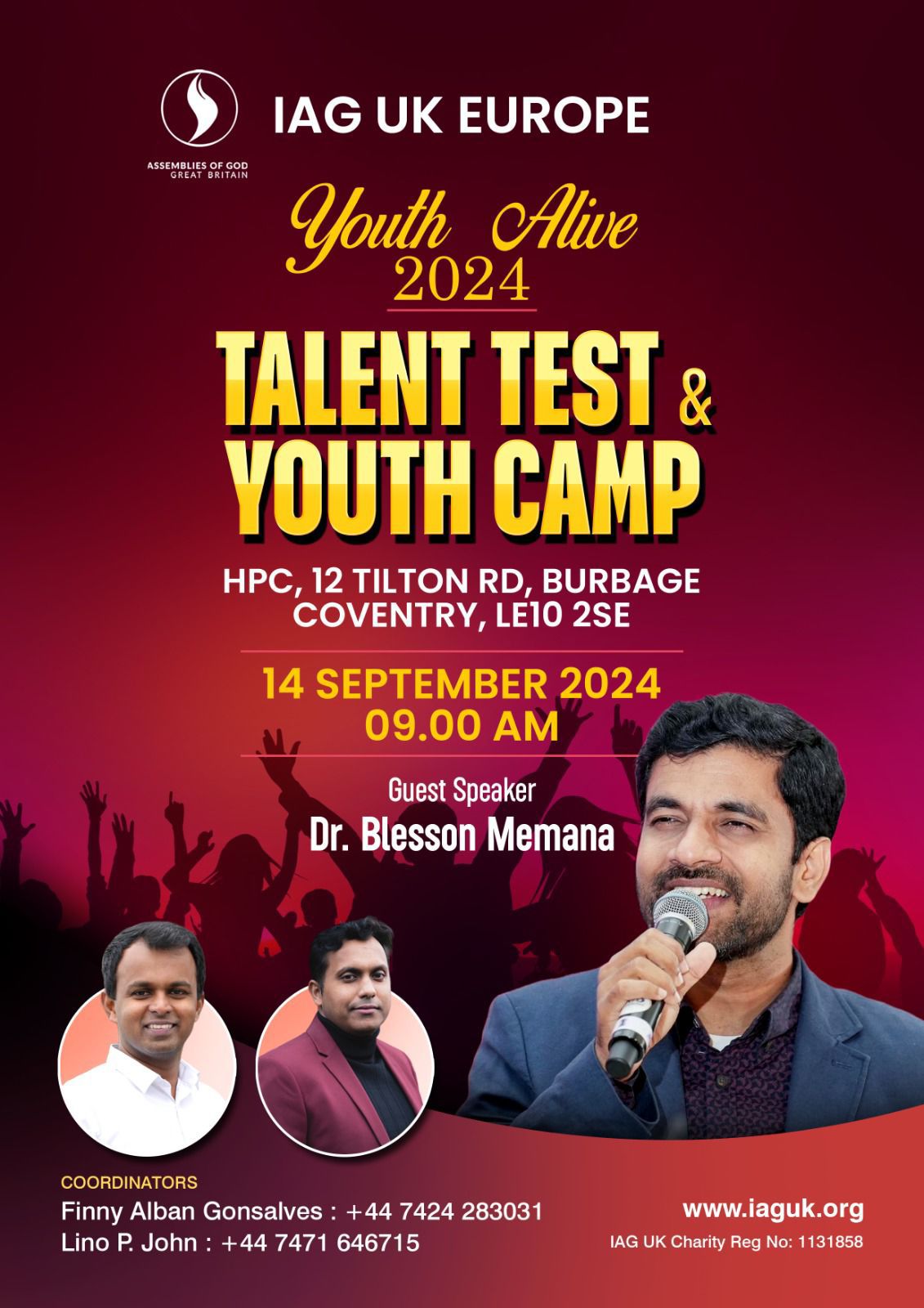 ഇംഗ്ലണ്ട് : ഐഎജി യുകെ & യൂറോപ്പിന്റെ ഏകദിന യുവജന ക്യാമ്പും ടാലെന്റ് ടെസ്റ്റും നാളെ (സെപ്റ്റംബർ 14) കവൻട്രിയിൽ നടക്കും. ചെയർമാൻ റവ.ബിനോയ് എബ്രഹാം ഉദ്ഘാടനം ചെയ്യും. ഡോ. ബ്ലസൻ മേമന മുഖ്യ അതിഥി ആയിരിക്കും.