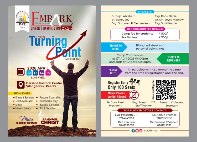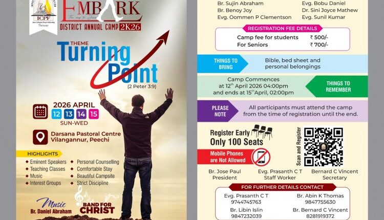 തൃശ്ശൂർ : തൃശ്ശൂർ ഐ.സി.പി.എഫ് ജില്ലാ വാർഷിക ക്യാമ്പ് ഏപ്രിൽ 12 ഞായറാഴ്ച മുതൽ 15 ബുധനാഴ്ച വരെ വില്ലടം ദർശന പാസ്റ്ററൽ സെന്ററിൽ വെച്ച് നടക്കും. യുവാക്കളുടെ ജീവിതത്തിൽ ഒരു വഴിത്തിരിവ് ലക്ഷ്യമിട്ടുകൊണ്ട് “റ്റേർണിങ് പോയിന്റ് എന്നതാണ് ഈ വർഷത്തെ പ്രധാന ചിന്താവിഷയം.