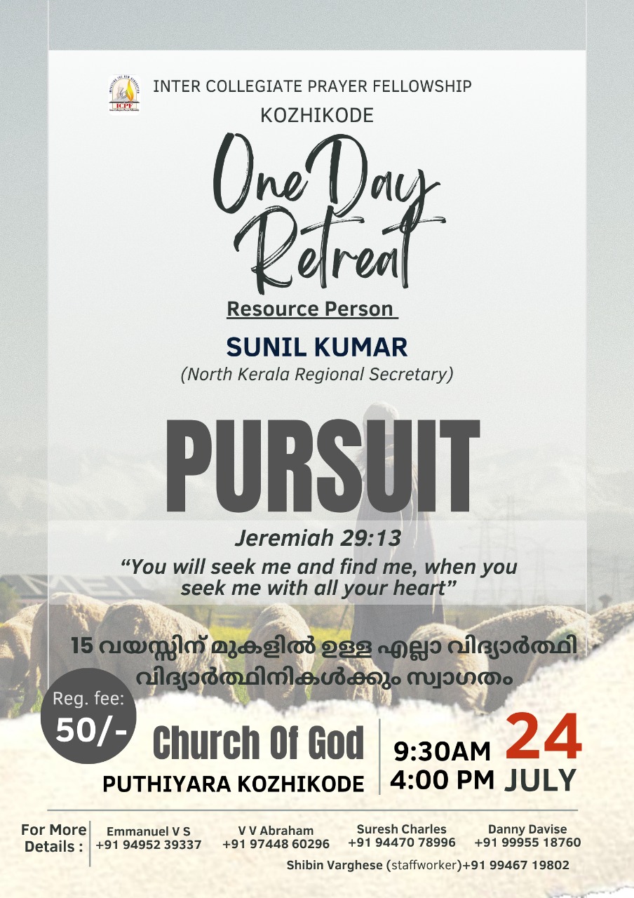ഐ സി പി എഫ് നോർത്ത് കേരള റീജിയൻ സെക്രട്ടറി ബ്രദർ സുനിൽകുമാർ ക്ലാസുകൾ നയിക്കും. “പെർസ്യൂട്ട് ” എന്നതാണ് സെമിനാർ തീം. 15 വയസിന് മുകളിൽ ഉള്ള എല്ലാ വിദ്യാർത്ഥികൾക്കും പങ്കെടുക്കാം. രജിസ്ട്രേഷൻ ഫീസ് 50 രൂപയാണ്.