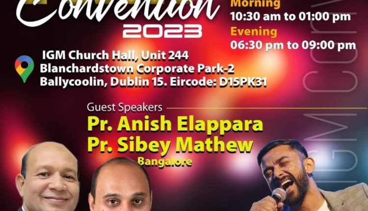 ഡബ്ളിൻ: ഇമ്മാനുവേൽ ഗോസ്പൽ മിഷന്റെ ആഭിമുഖ്യത്തിൽ ബല്ലികൂളിൻ ബ്ലാങ്കാർഡ്സ് ടൗൺ കോർപ്പറേറ്റ് പാർക്ക് 2 യൂണിറ്റ് 244 ഐ ജി എം ചർച്ച് ഹാളിൽ നവം 2-4 വരെ കൺവൻഷൻ നടക്കും. രാവിലെയും രാത്രിയും നടക്കുന്ന പൊതുയോഗങ്ങളിൽ പാസ്റ്റർമാരായ അനിഷ് ഏലപ്പാറ, സിബി മാത്യു എന്നിവർ പ്രസംഗിക്കും. ഇവാ. ഇമ്മാനുവേൽ കെ ബി ആരാധന നയിക്കും. പാ.ബിനിൽ ഫിലിപ്പ്, ബ്രദർ ബൈജു സാമുവേൽ രാജു എന്നിവർ ശുശ്രൂഷകൾക്ക് നേതൃത്വം കൊടുക്കും