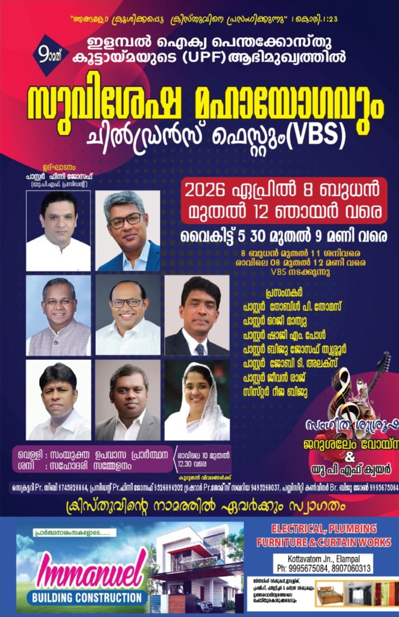 ഇളമ്പൽ യു.പി.എഫ് ന്റെ ഒമ്പതാമത് വാർഷിക കൺവെൻഷൻ ഏപ്രിൽ 8 ബുധൻ മുതൽ 12 ഞായർ വരെ ഇളമ്പൽ ടൗണിന് സമീപം തയ്യാർ ചെയ്യുന്ന പന്തലിൽ വച്ച് നടക്കും. പ്രസിഡണ്ട് പാസ്റ്റർ ഫിന്നി ജോസഫ് കൺവെൻഷൻ ഉദ്ഘാടനം ചെയ്യും. പാസ്റ്റർമാരായ നോബിൾ പി തോമസ്, റെജി മാത്യു, ഷാജി എം പോൾ, ബിജു ജോസഫ്, ജോബി ടി അലക്സ് എന്നിവർ രാത്രി യോഗങ്ങളിൽ പ്രസംഗിക്കും. വെള്ളിയാഴ്ച രാവിലെ നടക്കുന്ന സംയുക്ത ഉപവാസ പ്രാർത്ഥനയിൽ പാ: ജീവൻ രാജും ശനിയാഴ്ച പകൽ നടക്കുന്ന സംയുക്ത സഹോദരി സമ്മേളനത്തിൽ സിസ്റ്റർ ഷീജ ബിജുവും ശിശ്രൂഷിയ്ക്കും. കുഞ്ഞുങ്ങൾക്കായുള്ള വി ബി എസ്സിന് എക്സൽ മിനിസ്ട്രീസ് നേതൃത്വം വഹിക്കും. യു.പി.എഫ് ക്വയറും ജെറുസലേം വോയിസും ഗാനശുശ്രൂഷ നിർവഹിക്കും. പാസ്റ്റർ ബൈജു തങ്കച്ചൻ, പാസ്റ്റർ കുര്യൻ മോനച്ചൻ (വൈസ് പ്രസിഡണ്ടുമാർ) പാസ്റ്റർ സിബി (സെക്രട്ടറി) പാസ്റ്റർ ടി ജോർജുകുട്ടി (ജോയിന്റ് സെക്രട്ടറി) പാസ്റ്റർ തോമസ് സഖറിയ (ട്രഷറർ) തുടങ്ങിയവരുടെ നേതൃത്വത്തിലുള്ള യു.പി.എഫ് കമ്മിറ്റി