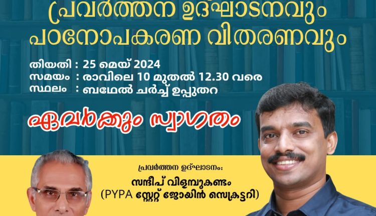 ഉപ്പുതറ : ഇന്ത്യ പെന്തകോസ്ത് ചർച്ച് ഓഫ് ഗോഡിന്റെ ആഭിമുഖ്യത്തിൽ പിവൈപിഎ ഉപ്പുതറ സെൻറർ പ്രവർത്തന ഉദ്ഘാടനവും പഠനോപകരണ വിതരണവും നാളെ രാവിലെ 10 മുതൽ ഉപ്പുതറ ബെഥേൽ ചർച്ചിൽ നടക്കും. പിവൈപിഎ സംസ്ഥാന ജോയിന്റ് സെക്രട്ടറി സന്ദീപ് വിളമ്പുകണ്ടം പ്രവർത്തന ഉദ്ഘാടനം നിർവഹിക്കും. സെന്റർ ശുശ്രൂഷകൻ പാസ്റ്റർ കെ.വി. വർക്കി പഠനോപകരണ വിതരണ ഉദ്ഘാടനംചെയ്യും