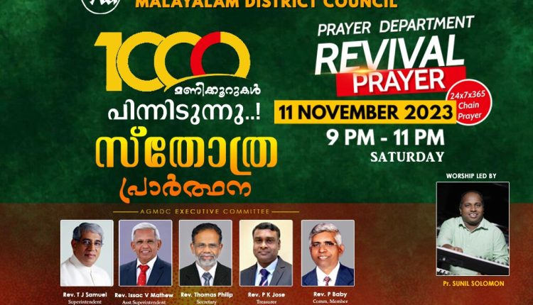 അസംബ്ലീസ് ഓഫ് ഗോഡ് മലയാളം ഡിസ്ട്രിക്ട് പ്രയർ ഡിപ്പാർട്ട്മെൻ്റ് നേതൃത്വം നല്കുന്ന റിവൈവൽ പ്രയർ എന്ന തുടർമാന പ്രാർത്ഥന ആയിരാമത് മണിക്കൂറിലേക്ക്. ഒക്ടോബർ ഒന്നിന് രാവിലെ ആറിന് സൂം പ്ലാറ്റ്ഫോമിൽ ആരംഭിച്ച പ്രാർത്ഥന നിലയ്ക്കാതെ തുടരുകയാണ്.