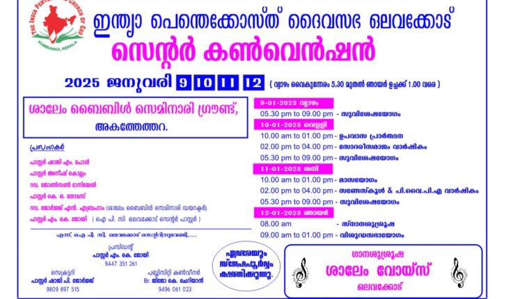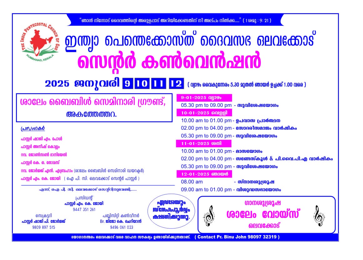 ഒലവക്കോട് : ഐപിസി ഒലവക്കോട് സെന്ററിന്റെ ആഭിമുഖ്യത്തിൽ 2025 ജനുവരി 9 മുതൽ 12 വരെ ശാലേം ബൈബിൾ സെമിനാരിയിൽ സെന്റർ കൺവൻഷൻ നടക്കും.