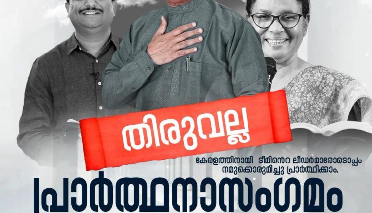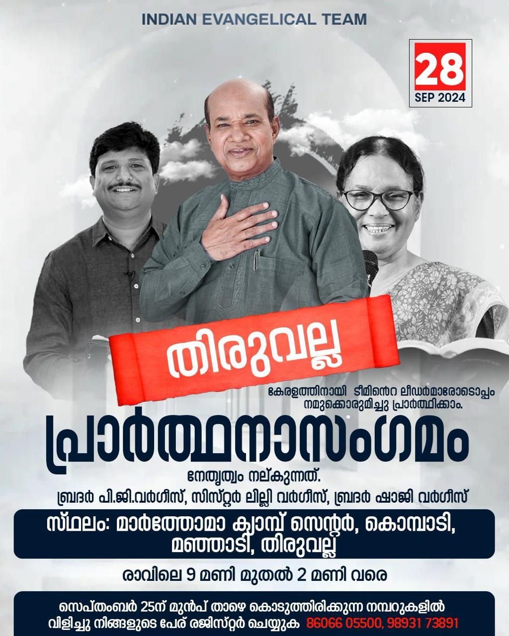 തിരുവല്ലയിൽ ഇന്ത്യൻ ഇവാഞ്ചലിക്കൽ ടീം പ്രാർത്ഥന സംഗമം ChristianNews Last updated Aug 19, 2024 54 തിരുവല്ല : ഇന്ത്യൻ ഇവാഞ്ചലിക്കൽ ടീമിന്റെ ആഭിമുഖ്യത്തിൽ സെപ്റ്റംബർ 28 ന് തിരുവല്ല മഞ്ഞാടി കൊമ്പാടി മാർത്തോമാ ക്യാമ്പ് സെന്ററിൽ പ്രാർത്ഥന സംഗമം നടക്കും. ബ്രദർ പി. ജി. വർഗീസ്, സിസ്റ്റർ ലില്ലി വർഗീസ്, ബ്രദർ ഷാജി വർഗീസ് എന്നിവർ നേതൃത്വം നൽകും 54 Share