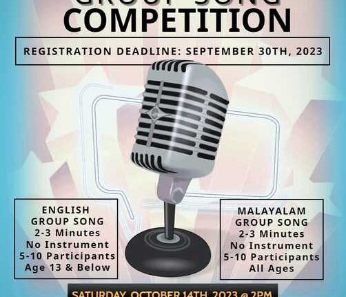 ഹാമിൽട്ടൺ:കാനഡയിലെ ഹാമിൽട്ടൺ കേന്ദ്രമായി പ്രവർത്തിക്കുന്ന ഗുഡ് വിഷൻ മിനിസ്ട്രീസിന്റെ ആഭിമുഖ്യത്തിൽ ഇന്റർ ചർച്ച് ഗ്രൂപ്പ് സോങ് കോമ്പറ്റീഷൻ ഒക്ടോബർ 14 ശനിയാഴ്ച 2 ന് ഇമ്മാനുവേൽ ക്രിസ്ത്യൻ റീഫോമ്ഡ് ചർച്ച് ഹാമിൽട്ടണിൽ നടക്കും. 13 വയസ്സ് വരെയുള്ള കുട്ടികൾക്കായി ഇംഗ്ലീഷ് ഗ്രൂപ്പ് സോങ്.