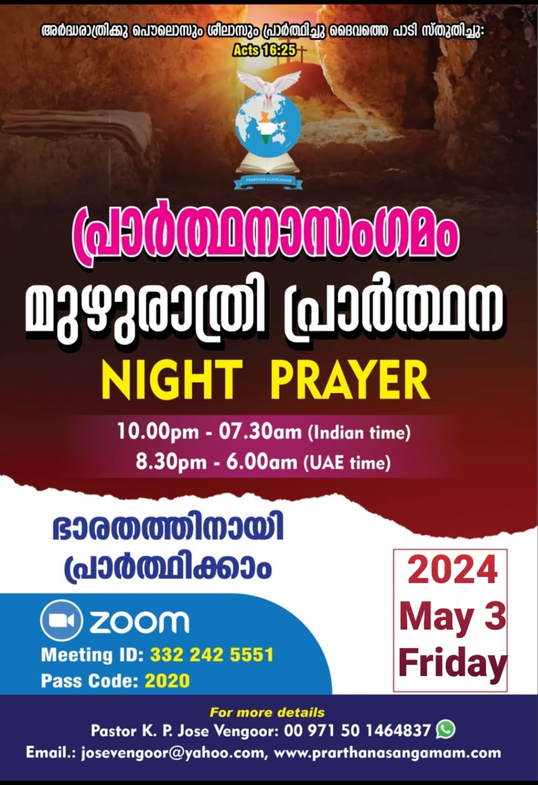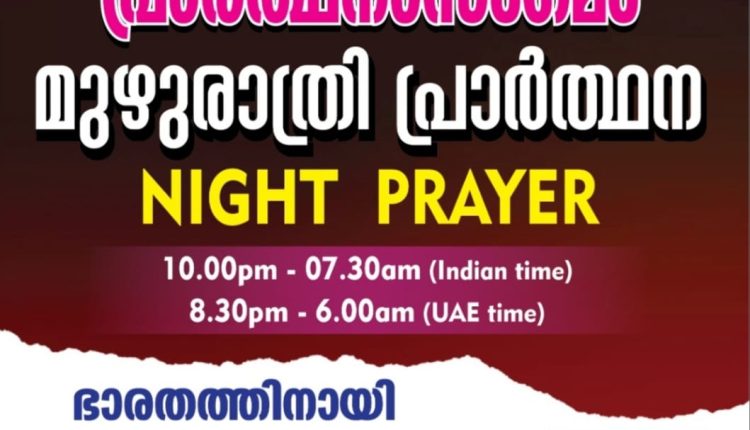 ഷാർജ : ഇന്റർനാഷണൽ പ്രയർ ഫെലോഷിപ്പ് പ്രാർത്ഥനാസംഗമം ഒരുക്കുന്ന മുഴുരാത്രി പ്രാർത്ഥന നാളെ രാത്രി എട്ടര മുതൽ രാവിലെ ആറു വരെ നടക്കും. രാജ്യങ്ങൾക്ക് വേണ്ടിയും കുടുംബങ്ങൾക്കായും തലമുറകൾക്കായും മറ്റുള്ളവരുടെ വിഷയങ്ങൾക്ക് വേണ്ടിയും പ്രത്യേകിച്ച് ഭാരതത്തിനു വേണ്ടിയും ഉള്ള പ്രാർത്ഥനകൾക്ക് പാസ്റ്റർ കെ. പി. ജോസ് വേങ്ങൂർ നേതൃത്വം നൽകും.