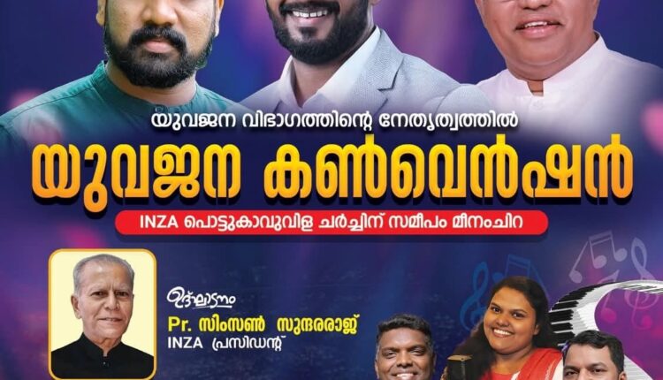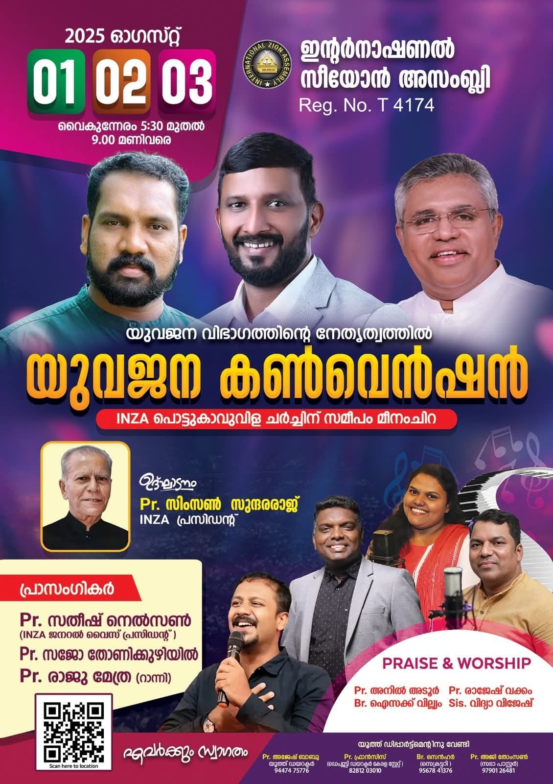 2025 ഓഗസ്റ്റ് 1, 2, 3 (വെള്ളി, ശനി, ഞായർ) -ദിവസങ്ങളിൽ പൊട്ടുകാവുവിള ചർച്ചിന് സമീപം മീനംചിറയിൽ ഇൻ്റർനാഷണൽ സീയോൻ അസംബ്ലി യുവജന വിഭാഗംക്രമികരിക്കുന്ന സുവിശേഷയോഗം സംഘടനാ പ്രസിഡൻ്റ് പാസ്റ്റർ സിംസൺസുന്ദരാജ് ഉദ്ഘാടനം ചെയ്യും.