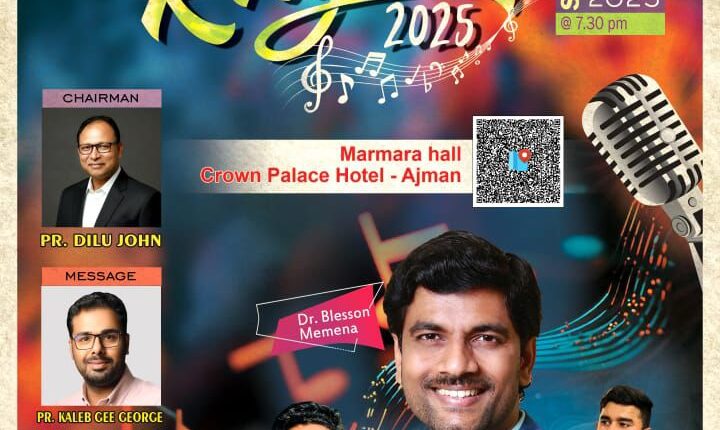സഭാ സീനിയർ പാസ്റ്റർ: ദിലു ജോൺ അധ്യക്ഷനാകുന്ന യോഗത്തിൽ ഡോ. ബ്ലസ്സൻ മേമന ആത്മീയ ഗാന ശുശ്രൂഷയ്ക്ക് നേതൃത്വം നൽകും .യു. എ. ഈലെ അനുഗ്രഹീത ഗായകരായ ഡെനിലോ ഡെനിസ്, ഷാരൺ മേരി ഐസക് ,ലാറ സ്റ്റാൻലി, ,കെസിയ ഷാജി , റോബിൻ സാജൻ, ജിജു സാം