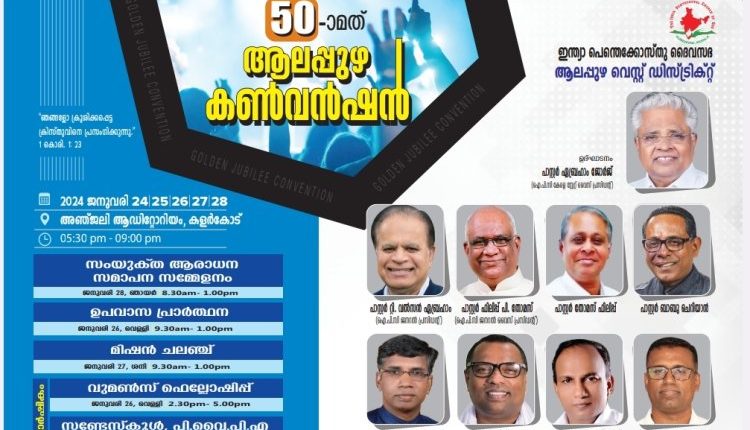 ആലപ്പുഴ: ഇന്ത്യ പെന്തെക്കോസ്ത് ദൈവസഭ ആലപ്പുഴ വെസ്റ്റ് ഡിസ്ട്രിക്ട് സുവർണ്ണ ജൂബിലി കൺവൻഷൻ കൺവൻഷൻ ജനുവരി 24 മുതൽ 28 വരെ ആലപ്പുഴ കളർകോട് അഞ്‌ജലി ആഡിറ്റോറിയത്തിൽ നടക്കും. 24ന് വൈകിട്ട് ഐ.പി.സി കേരളാ സ്റ്റേറ്റ് വൈസ് പ്രസിഡന്റ്‌ & ആലപ്പുഴ വെസ്റ്റ് ഡിസ്ട്രിക്ട് പ്രസിഡന്റുമായ പാസ്റ്റർ ഏബ്രഹാം ജോർജ് ഉത്ഘാടനം നിർവഹിക്കും.