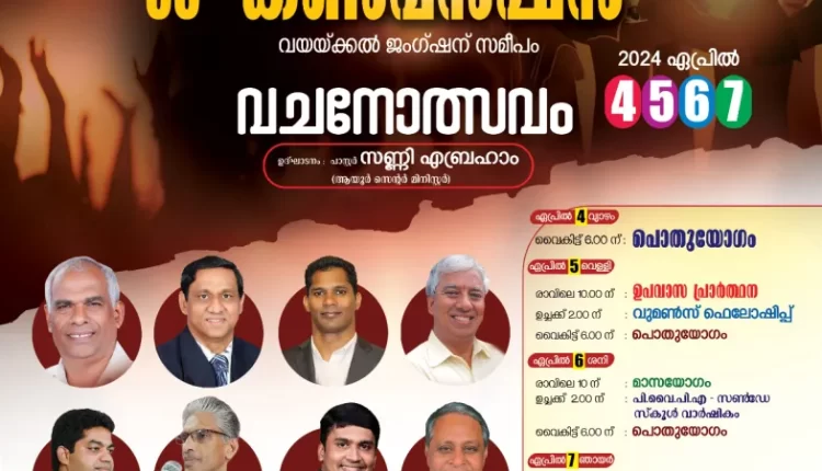 ആയൂർ : ഐപിസി ആയൂർ സെന്റർ 33 – മത് കൺവൻഷൻ വയയ്ക്കൽ ജംക്ഷനിൽ ഏപ്രിൽ 4-7 വരെ നടക്കും. ഐപിസി ആയൂർ സെന്റർ ശുശ്രുഷകൻ പാ. സണ്ണി എബ്രഹാം ഉത്‌ഘാടനം ചെയ്യുന്ന കൺവൻഷനിൽ പാസ്റ്റർമാരായ ബി. മോനച്ചൻ, കെ. ജെ. തോമസ്, ഡോ. അലക്സ് ജോൺ, ജോൺസൺ ദാനിയേൽ, മാത്യു കെ. വർഗീസ്, ഫെയ്ത്ത് ബ്ലെസ്സൺ, തോമസ് ഫിലിപ്പ് എന്നിവർ വചനശുശ്രുഷ നിർവഹിക്കും. താബോർ വോയ്‌സ്, ഉമ്മന്നൂർ ഗാനശുശ്രുഷയ്ക്ക് നേതൃത്വം നൽകും.