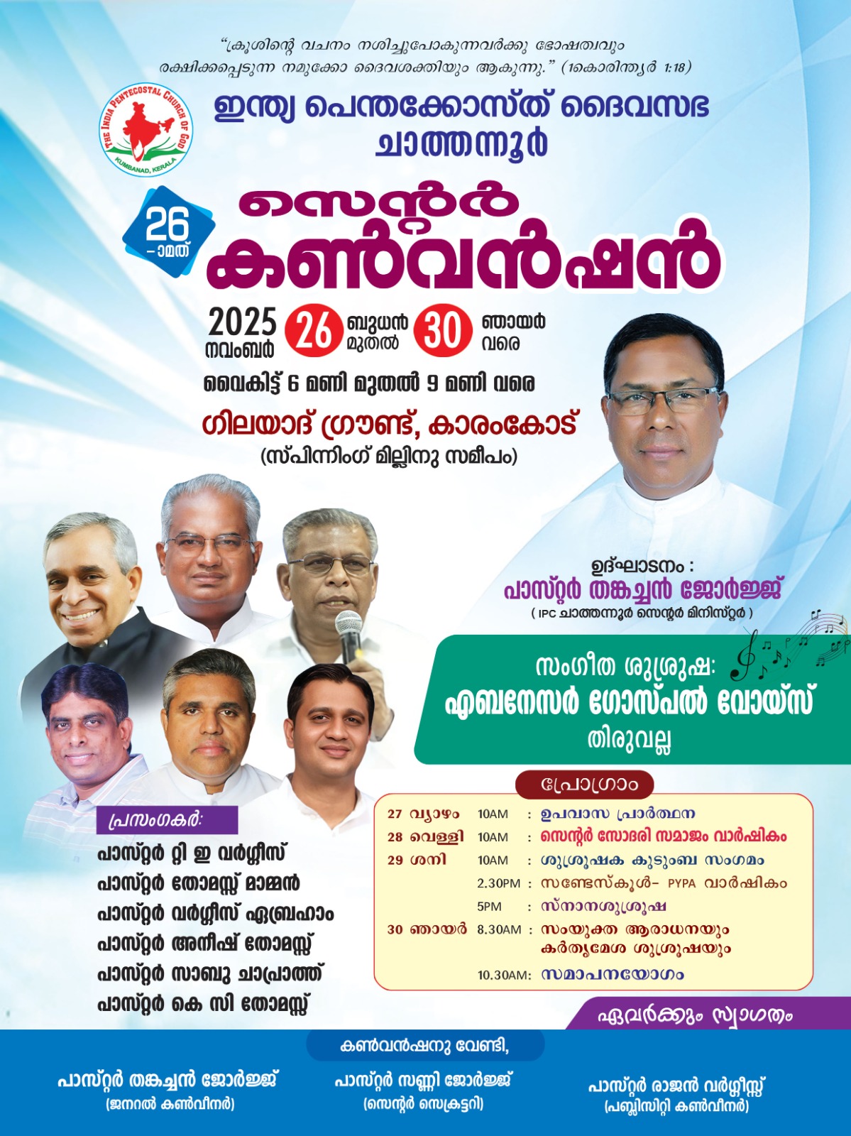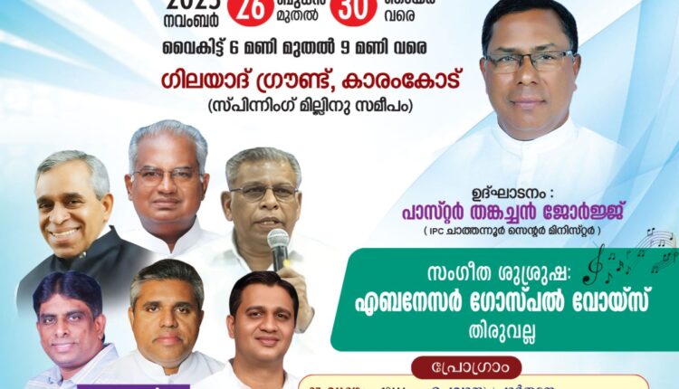 കൊല്ലം: ഇന്ത്യാ പെന്തക്കോസ്ത് ദൈവസഭ ചാത്തന്നൂർ 26 – മത് സെന്റർ കൺവൻഷൻ 2025 നവംബർ 26 ബുധനാഴ്ച കാരംകോട് സ്പിന്നിംഗ് മില്ലിനു സമീപം ഗിലയാദ് ഗ്രൗണ്ടിൽ സെന്റർ ശുശ്രൂഷകൻ പാസ്റ്റർ തങ്കച്ചൻ ജോർജ് ഉദ്ഘാടനം ചെയ്യും. പാസ്റ്ററന്മാരായ റ്റി. ഇ. വർഗീസ്, തോമസ് മാമ്മൻ , വർഗീസ് ഏബ്രഹാം, അനീഷ് തോമസ്, സാബു ചാപ്രാത്ത്, എന്നിവർ പ്രസംഗിക്കും. 30ന് സമാപന സമ്മേളനത്തിൽ പാസ്റ്റർ കെ.സി. തോമസ് പ്രസംഗിക്കും.