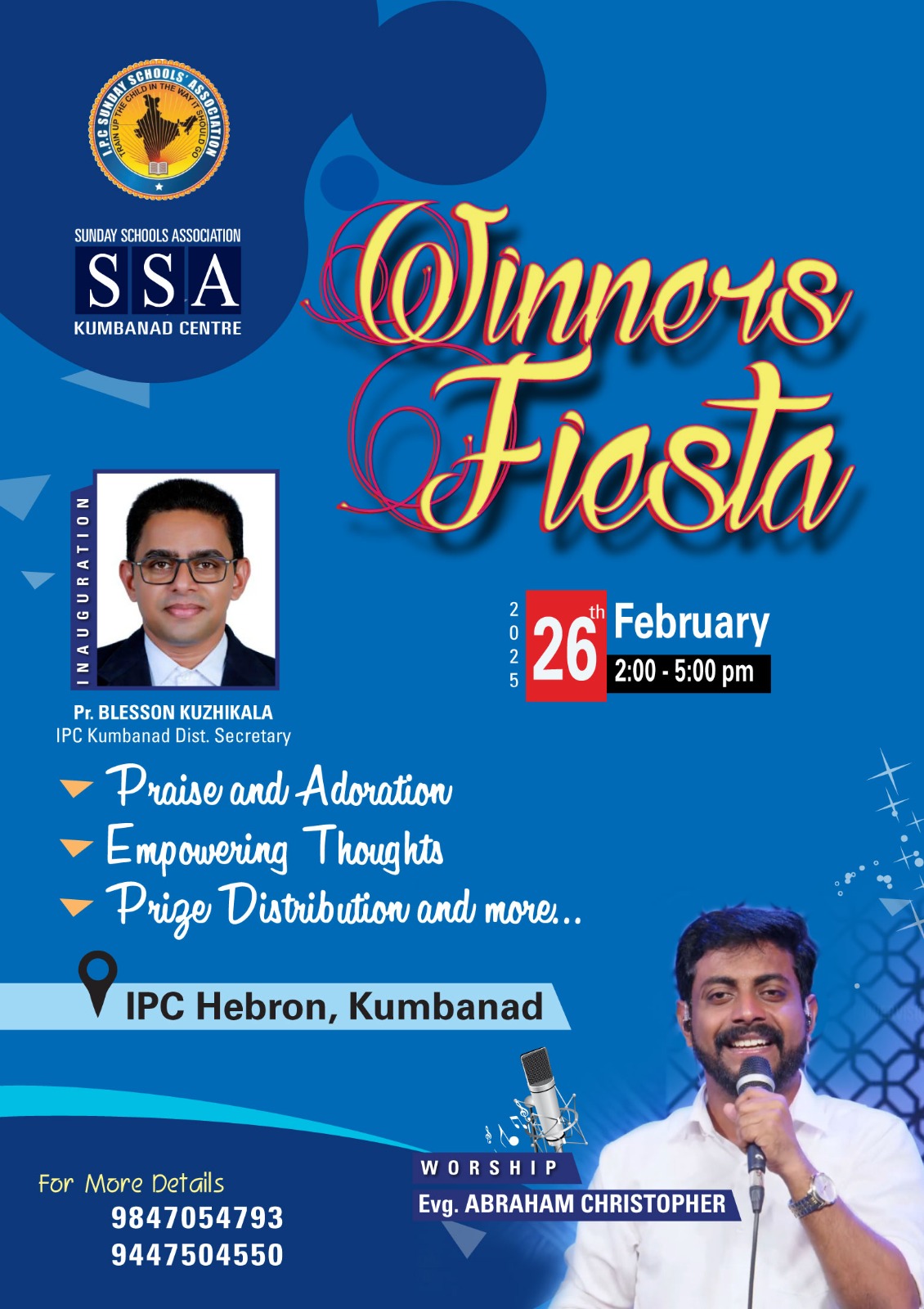 2 മണിക്ക് ആദരവ് 2025 വാർഷിക സമ്മേളനം ഐപിസി സെൻ്റർ സെക്രട്ടറി പാസ്റ്റർ ബ്ലസൻ കുഴിക്കാല ഉദ്ഘാടനം ചെയ്യും. ഡിസ്ട്രിക്റ്റ് സൺഡേസ്കൂൾ സൂപ്രണ്ട് ജോജി ടി.മാത്യു അധ്യക്ഷത വഹിക്കും. സൺഡേസ്കൂൾ മേഖല പ്രസിഡൻ്റ് ജോജി ഐപ്പ് മാത്യൂസ് സമാപനസന്ദേശവും സമ്മാനദാനവും നിർവഹിക്കും. ഒരു ദശാബ്ദത്തിലധികം സൺഡേസ്കൂൾ അധ്യാപകരായിരുന്നവരെ ആദരിക്കും. ഏബ്രഹാം ക്രിസ്റ്റഫർ സംഗീതശുശ്രൂഷ നടത്തും.