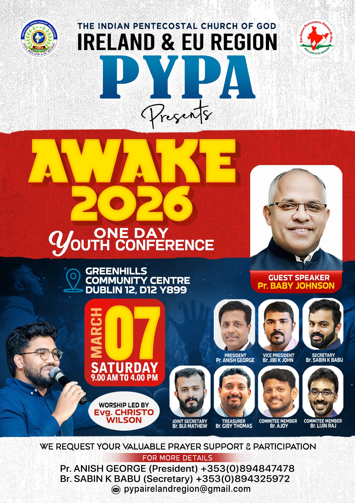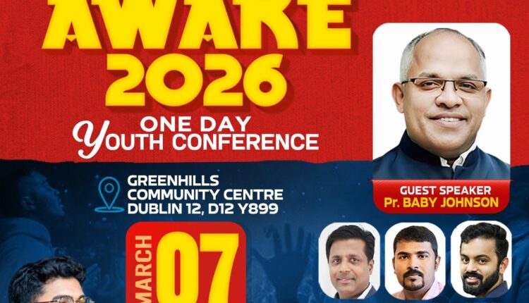 ഡബ്ലിൻ, അയർലൻ്റ്: ഐപിസി അയർലൻഡ് ആൻഡ് ഈയു റീജിയൻ പി വൈ പി എയുടെ നേതൃത്വത്തിൽ ഏകദിന യൂത്ത് കോൺഫറൻസ് എവേക്ക് 2026 ഡബ്ലിനിലെ ഗ്രീൻഹിൽസ് കമ്മ്യൂണിറ്റി സെൻ്ററിൽ വച്ച് മാർച്ച് 7 ശനിയാഴ്ച രാവിലെ 9 മുതൽ വൈകിട്ട് 4 വരെ നടത്തപ്പെടുന്നു. പിവൈപിഎ പ്രസിഡൻറ് പാസ്റ്റർ അനീഷ് ജോർജിന്റെ അധ്യക്ഷതയിൽ നടക്കുന്ന കോൺഫറൻസിൽ പാസ്റ്റർ ബേബി ജോൺസൺ മുഖ്യപ്രഭാഷകനായിരിക്കും. ഇവാ. ക്രിസ്റ്റോ വിൽസൻ്റെ നേതൃത്വത്തിൽ പിവൈപിഎ ക്വയർ ഗാനശുശ്രൂഷ നിർവഹിക്കും. പങ്കെടുക്കുവാൻ താല്പര്യമുള്ളവർ സൗജന്യ രജിസ്ട്രേഷൻ ചെയ്യേണ്ടതാണ്. അതിനുള്ള ലിങ്ക് താഴെ കൊടുക്കുന്നു.