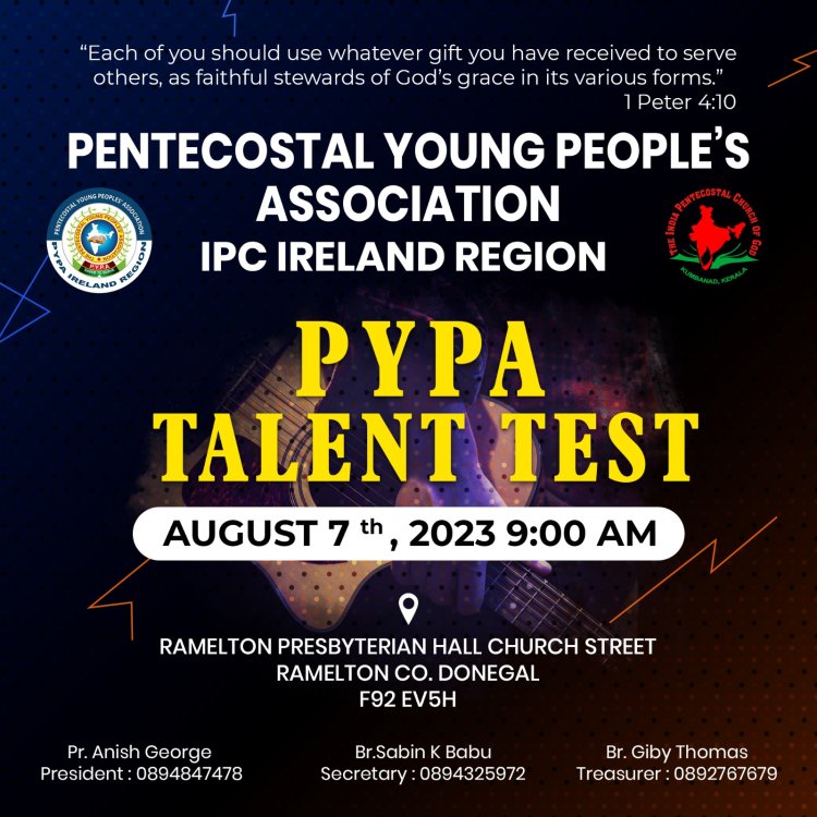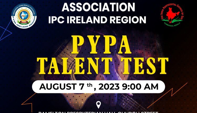 അയർലൻഡ് : ഐ.പി.സി അയർലണ്ട് റീജിയൺ പി.വൈ.പി.എ ടാലന്റ് ടെസ്റ്റ് ഓഗസ്റ്റ് ഏഴാം തീയതി റാമിൽഡൺ പ്രെസ്ബെറ്റീരിയൻ ഹാൾ, ഡോനിഗൽ നടക്കും. പ്രസിഡണ്ട് പാസ്റ്റർ അനീഷ് ജോർജ്, വൈസ് പ്രസിഡന്റ് ജിബി കെ ജോൺ, സെക്രട്ടറി സബിൻ കെ ബാബു, ജോയിന്റ് സെക്രട്ടറി ബിജി മാത്യു, ട്രഷറർ ജിബി തോമസ് എന്നിവർ നേതൃത്വം നൽകും. കൂടുതൽ വിവരങ്ങൾക്ക് : പാസ്റ്റർ അനീഷ് ജോർജ് – 0894847478, ബ്രദർ സബിൻ ബാബു – 0894325972.