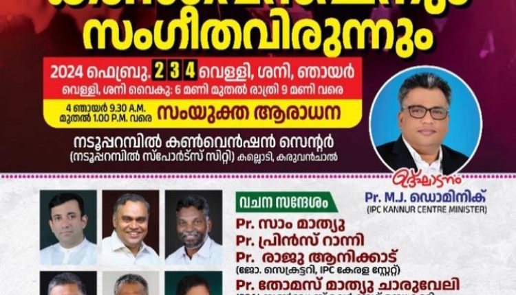 കരുവൻഞ്ചാൽ : ഐപിസി കണ്ണൂർ സെന്റർ കൺവൻഷൻ ഫെബ്രുവരി 2 മുതൽ 4 വരെ കരുവൻഞ്ചാൽ നടുപ്പറമ്പിൽ കൺവൻഷൻ സെന്ററിൽ നടക്കും. സെന്റർ ശുശ്രുഷകൻ പാസ്റ്റർ എം.ജെ. ഡോമനിക് ഉദ്ഘാടനം നിർവഹിക്കും. പാസ്റ്റർമാരായ സാം മാത്യു, പ്രിൻസ് റാന്നി, രാജു ആനിക്കാട്, തോമസ് മാത്യു ചാരുവേലി, വർക്കി എബ്രഹാം കാച്ചാണത്തു, ഷീല ദാസ് എന്നിവർ വിവിധ സെക്ഷനുകളിൽ പ്രസംഗിക്കും. വൈകിട്ടു 6 മണി മുതൽ പൊതുയോഗം ഉണ്ടായിരിക്കും. ഫെബ്രുവരി 3 രാവിലെ 10 മുതൽ 12 വരെ വുമൺസ് ഫെലോഷിപ്പ് സമ്മേളനം, ഉച്ചയ്ക്ക് 3 മുതൽ 5വരെ പി വൈ പി എ, സൺഡേ സ്കൂൾ സംയുക്ത വാർഷിക സമ്മേളനങ്ങൾ എന്നിവയും നടക്കും. ഞായറാഴ്ച രാവിലെ 9.30മുതൽ ആരംഭിക്കുന്ന സംയുക്ത ആരാധനായോടെ കൺവൻഷൻ സമാപിക്കും. പാസ്റ്റർമാരായ ടി.ബി റെജി, പി.ജെ ജോസ്, ജോർജ് തോമസ്, ജോൺ വി. ജേക്കബ് എന്നിവർ നേതൃത്വം നൽകും.