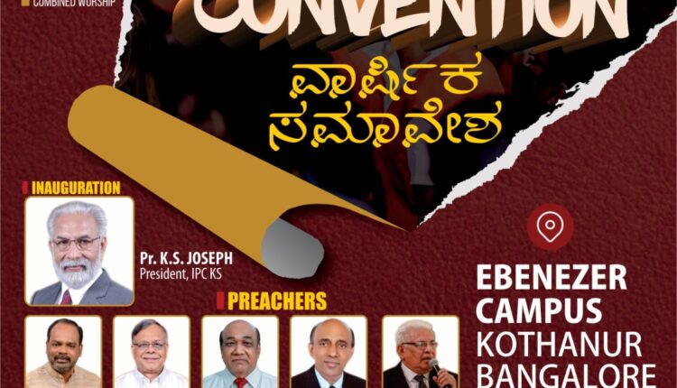 ബെംഗളൂരു: ഇന്ത്യാ പെന്തെക്കൊസ്ത് ദൈവസഭ (ഐപിസി ) കർണാടക സ്റ്റേറ്റ് 38-ാമത് വാർഷിക കൺവൻഷൻ ജനുവരി 9 വ്യാഴം മുതൽ 12 ഞായർ വരെ കൊത്തന്നൂർ എബനേസർ ക്യാംപസ് ഗ്രൗണ്ടിൽ നടക്കും. വൈകിട്ട് ആറിന് സ്റ്റേറ്റ് പ്രസിഡൻറ് പാസ്റ്റർ കെ.എസ്.ജോസഫ് കൺവൻഷൻ ഉദ്ഘാടനം ചെയ്യും.