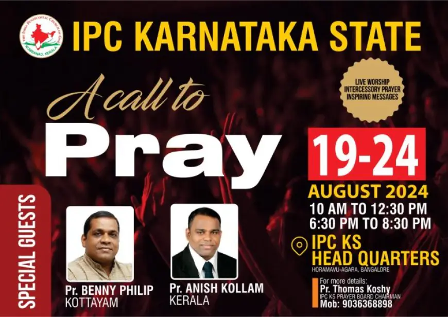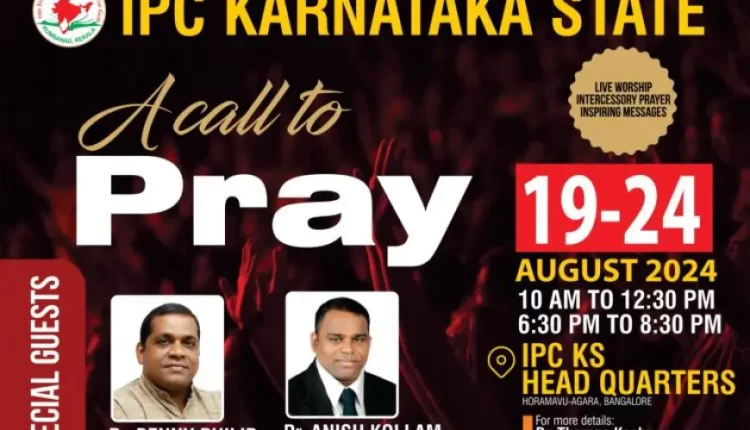 കർണാടക : ഐപിസി കർണാടക സ്റ്റേറ്റിൻ്റെ ആഭിമുഖ്യത്തിൽ ആഗസ്റ്റ് 19 മുതൽ 24 വരെ ഹൊറമാവ് അഗര ഐപിസി ഹെഡ്ക്വാർട്ടേഴ്സ് ഹാളിൽ പ്രത്യേക ഉപവാസ പ്രാർഥന നടക്കും. പാ. ബെന്നി ഫിലിപ്പ് കോട്ടയം, പാ. അനീഷ് കൊല്ലം എന്നിവർ മുഖ്യ പ്രസംഗകർ ആയിരിക്കും.