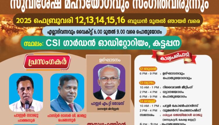 സി.എസ്.ഐ ഗാർഡൻ ഓഡിറ്റോറിയത്തിൽ നടക്കുന്ന യോഗങ്ങൾ സെൻ്റർ മിനിസ്റ്റർ പാസ്റ്റർ എം. റ്റി. തോമസ് ഉദ്ഘാടനം ചെയ്യും.