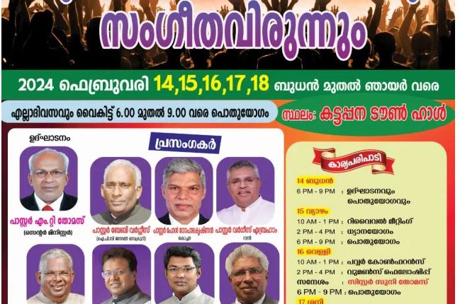 കട്ടപ്പന : ഐപിസി കട്ടപ്പന 36-മത് സെന്റർ കൺവൻഷൻ ഫെബ്രുവരി 14 മുതൽ 18 വരെ നടത്തപെടുന്നു. എല്ലാ ദിവസവും രാവിലെ 10 മണി മുതൽ ഒരു മണി വരെയും വൈകിട്ട് 6 മണി മുതൽ രാത്രി 9 മണി വരെയും കട്ടപ്പന ടൗൺ ഹാളിൽ വച്ചാണ് യോഗങ്ങൾ നടക്കുന്നത്. സെന്റർ മിനിസ്റ്റർ പാസ്റ്റർ എം. റ്റി തോമസ് ഉദ്ഘാടനം ചെയ്യുന്ന യോഗങ്ങളിൽ പാസ്റ്റർമാരായ ബേബി വർഗീസ് ,പോൾ ഗോപാലകൃഷ്ണൻ കൊച്ചറ, വർഗീസ് എബ്രഹാം റാന്നി, ബ്രദർ വർക്കി കാച്ചാണത്ത് , സാം ജോസഫ് (കുമരകം ), റെജി ശാസ്താംകോട്ട, പി. സി ചെറിയാൻ (റാന്നി ) എന്നിവർ ദൈവവചനം സംസാരിക്കും.