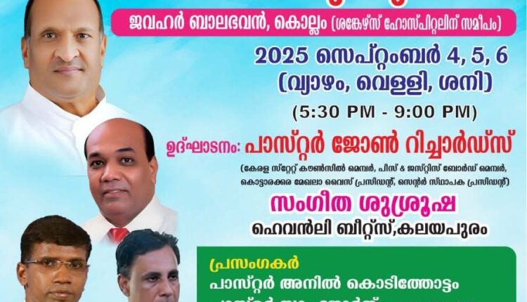 കൊല്ലം : ഐപിസി കൊല്ലം സൗത്ത് സെന്ററിന്റെ ആഭിമുഖ്യത്തിൽ വ്യാഴാഴ്ച മുതൽ ശനിയാഴ്ച വരെ കൊല്ലം ജവഹർ ബാലഭവനിൽ സുവിശേഷ മഹായോഗവും സംഗീത വിരുന്നും നടക്കും. പാ. ജോൺ റിച്ചാർഡ്സ് ഉദ്ഘാടനം നിർവഹിക്കും. കളയപുരം ഹെവൻലി ബീറ്റ്സ് ഗാന ശുശ്രൂഷ നിർവഹിക്കും. പാസ്റ്റർമാരായ സാം ജോർജ്, അനിൽ കൊടിത്തോട്ടം, സജു ചാത്തന്നൂർ എന്നിവർ പ്രസംഗിക്കും.