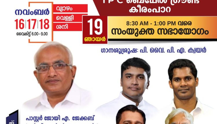 ഐപിസി കോതമംഗലം ഏരിയാ കൺവെൻഷൻ 2023 നവംബർ 16 വ്യാഴം മുതൽ 19 ഞായർ വരെ കീരംപാറ ഐപിസി ബെഥേൽ ഗ്രൗണ്ടിൽ വെച്ച് നടത്തപ്പെടുന്നു. 16 വ്യാഴം ഏരിയാ കൺവീനർ പാസ്റ്റർ ജോയി എ. ജേക്കബ് സമർപ്പണ ശുശ്രൂഷ നിർവഹിക്കുകയും പാ. ഫെയ്ത്ത് ബ്ലെസ്സൺ പള്ളിപ്പാട് ദൈവവചനം ശുശ്രൂഷിക്കുകയും ചെയ്യും. 17 വെള്ളി രാവിലെ 10 മണി മുതൽ 1 മണി വരെ സോദരി സമാജം വാർഷികം നടത്തപെടും. സിസ്റ്റർ ഷീല ദാസ് കീഴൂർ സന്ദേശം നൽകും. വൈകുന്നേരം പൊതുയോഗത്തിൽ പാ. കെ.ജെ. തോമസ് കുമളി സന്ദേശം നൽകും. 18 ശനി രാവിലെ 10 മുതൽ വൈകിട്ട് 4 മണി വരെ സൺഡേ സ്കൂൾ & പി.വൈ.പി.ഐ വാർഷികം നടക്കും. വൈകിട്ട് പൊതുയോഗത്തിൽ പാ. അനീഷ് റാന്നി ദൈവവചനം ശുശ്രൂഷിക്കും. 19 ഞായർ 8:30 മുതൽ 1 മണി വരെ സംയുക്ത സഭായോഗം നടത്തപ്പെടും. പാ. ജോൺസൺ ഡാനിയേൽ ചെറുവക്കൽ വചനം സംസാരിക്കും.