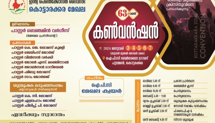 കൊട്ടാരക്കര: ഐപിസി കൊട്ടാരക്കര മേഖല കൺവെൻഷൻ ജനുവരി 3 മുതൽ 7 വരെ ഐപിസി ബേർശേബാ ഗ്രൗണ്ട് കൊട്ടാരക്കരയിൽ നടക്കും. മേഖല പ്രസിഡണ്ട് പാസ്റ്റർ ബെഞ്ചമിൻ വർഗീസ് ഉദ്ഘാടനം നിർവഹിക്കും. പാസ്റ്റർമാരായ കെ.ജെ തോമസ് കുമളി, ജയിംസ് ജോർജ്, വിൽസൺ വർക്കി, ജോൺ എസ്. മരത്തിനാൽ, ജോൺസൺ ഡാനിയേൽ, ഷിബു തോമസ്, സാം ജോർജ് എന്നിവർ പ്രസംഗിക്കും. ശുശ്രൂഷ കുടുംബ സംഗമത്തിൽ പാസ്റ്റർ കെ.സി തോമസ്, എബ്രഹാം ജോർജ്, പാസ്റ്റർ ഫിലിപ്പ് പി തോമസ് എന്നിവർ ക്ലാസുകൾ നയിക്കും. ഐപിസി മേഖലാ സംഗീത ശുശ്രൂഷയ്ക്ക് നേതൃത്വം നൽകും.
