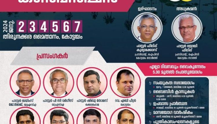 കോട്ടയം: ഐപിസി 85-ാമത് കോട്ടയം കൺവൻഷൻ ജനു. 2 ഇന്ന് മുതൽ 7 വരെ തിരുനക്കരയിൽ നടക്കും. കോട്ടയം സൗത്ത് സെന്റർ ശുശ്രൂഷകൻ പാസ്റ്റർ ജോയ് ഫിലിപ്പ് അദ്ധ്യക്ഷത വഹിക്കുന്ന ആദ്യദിനം നോർത്ത് സെന്റർ ശുശ്രൂഷകൻ പാസ്റ്റർ ഫിലിപ്പ് കുര്യാക്കോസ് സമ്മേളനം ഉദ്ഘാടനം നിർവഹിക്കും. പാസ്റ്റർമാരായ ജെയിംസ് ജോർജ് (യുഎസ്എ), പി.സി വർഗീസ് (യുഎസ്എ), ഷിബു തോമസ് (ഒക്കലഹോമ), എബി പീറ്റർ (കോട്ടയം), ഫെയ്ത്ത് ബ്ലെസ്സൻ പള്ളിപ്പാട്, അജു ബി. വർഗീസ് (കാനഡ) എന്നിവർ വിവിധ യോഗങ്ങളിൽ പ്രസംഗിക്കും. കൺവൻഷനിൽ ജീസൻ ജോർജിന്റെ നേതൃത്വത്തിലുള്ള മ്യൂസിക് ടീമിനോട് ചേർന്ന് ഷാരുൺ വര്ഗീസ്, ഇമ്മാനുവൽ കെ.ബി പാസ്റ്റർ ലോർഡ്സൺ ആന്റണി, സാംസൺ ചെങ്ങന്നൂർ, ജോയൽ പടവത്ത് എന്നിവർ ആരാധനകൾക്ക് നേതൃത്വം നൽകും.
