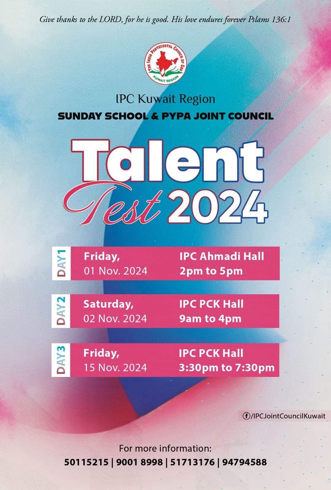 ഐപിസി കുവൈറ്റ് റീജിയൻ ടാലന്റ് ടെസ്റ്റ് ChristianNews On Oct 28, 2024 61 കുവൈറ്റ് : ഐപിസി കുവൈറ്റ് റീജിയൻ സൺഡേ സ്കൂൾ & പിവൈപിഎ ജോയിന്റ് കൗൺസിലിന്റെ ആഭിമുഖ്യത്തിൽ നവംബർ 1 ന് ഐപിസി അഹ്മദി ഹാളിലും 2 ന് ഐപിസി പിസികെ ഹാളിലും 15 ന് ഐപിസി പിസികെ ഹാളിലുമായി ടാലന്റ് ടെസ്റ്റ് നടക്കും. 61 Share