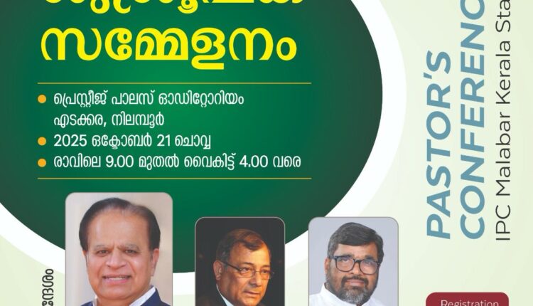 നിലമ്പൂർ: ഐ.പിസി മലബാർ കേരള സ്റ്റേറ്റ് പ്രഥമ ശുശ്രൂഷകാ സമ്മേളനം ഒക്ടോബർ 21 ന് നിലമ്പൂർ എടക്കര പ്രസ്റ്റീജ് പാലസ് ഓഡിറ്റോറിയത്തിൽ നടക്കും. രാവിലെ 9 മണിക്ക് ആരംഭിക്കുന്ന സമ്മേളനം ഐ.പി.സി ജനറൽ പ്രസിഡൻ്റ് പാസ്റ്റർ ഡോ. ടി വൽസൻ എബ്രഹാം ഉദ്ഘാടനം ചെയ്യും.