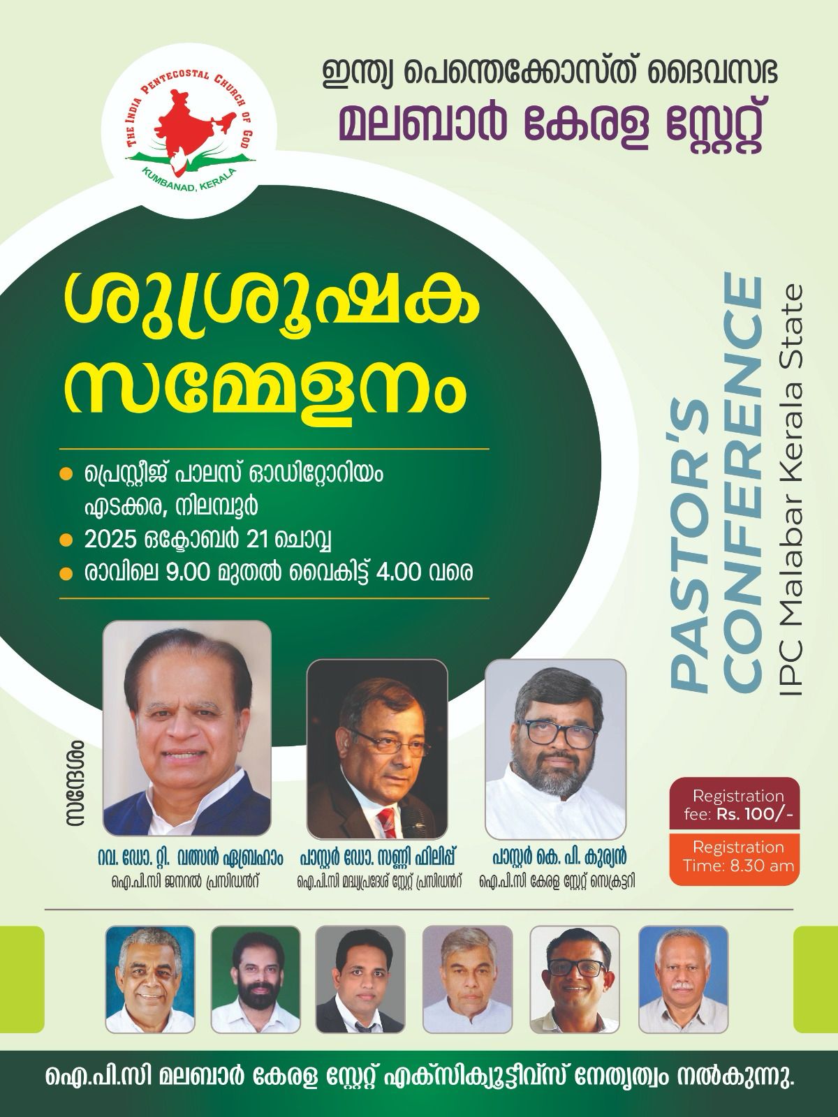 ഐ.പി.സി മലബാർ കേരള സ്റ്റേറ്റ് വൈ. പ്രസിഡൻ്റ് പാസ്റ്റർ ജിമ്മി കുര്യാക്കോസ്, ജോ. സെക്രട്ടറി ബ്രദർ വിൻസൻ്റ് തോമസ്, ട്രഷറർ ബ്രദർ ജോർജ് തോമസ് എന്നീവർ സമ്മേളനത്തിന് നേതൃത്വം നൽകും.