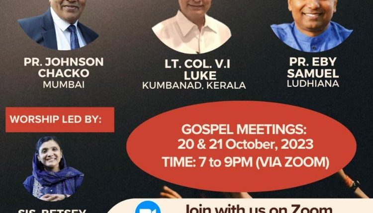 മുംബൈ : ഐപിസി മഹാരാഷ്ട്രാ സ്റ്റേറ്റ് നാസിക് ഡിസ്ട്രിക്ട് വാർഷിക കൺവെൻഷൻ ഒക്ടോബർ 20, 21 തീയ്യതികളിൽ വൈകുന്നേരം 7 മുതൽ 9 വരെ വേർച്വൽ പ്ലാറ്റ് ഫോമിൽ നടക്കും.